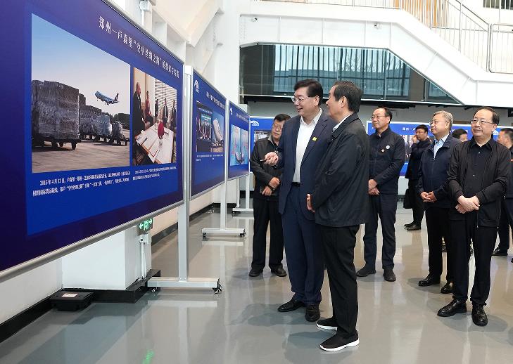 在位于鄭州航空港區(qū)的航投培訓(xùn)中心,劉奇葆首先參觀了“鄭盧‘空中絲綢之路’的探索與實(shí)踐”圖片展。張明超詳細(xì)介紹了35張圖片背后的故事和內(nèi)涵,匯報了“一帶一路”框架下鄭盧“空中絲路”的建設(shè)歷程和發(fā)展現(xiàn)狀。