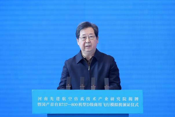 樓陽生為河南先進(jìn)航空仿真技術(shù)產(chǎn)業(yè)研究院揭牌。中國(guó)工程院院士趙沁平受聘擔(dān)任研究院專家技術(shù)委員會(huì)主任。民航河南監(jiān)管局向河南航投集團(tuán)頒發(fā)B737-800機(jī)型模擬機(jī)D級(jí)合格證。