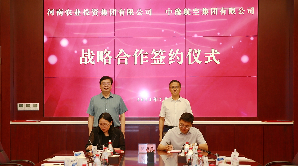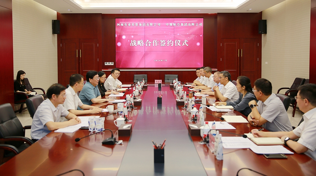 7月18日下午,中豫航空集團(tuán)與河南農(nóng)投集團(tuán)在農(nóng)投國際中心舉行工作會(huì)商,簽訂戰(zhàn)略合作協(xié)議。中豫航空集團(tuán)黨委書記、董事長(zhǎng)張明超;河南農(nóng)投集團(tuán)黨委書記、董事長(zhǎng)李曉寰,總經(jīng)理、副董事長(zhǎng)張淑杰參加會(huì)談并見證雙方簽約。中豫航空集團(tuán)副總經(jīng)理劉霞,河南農(nóng)投集團(tuán)副總經(jīng)理張峰代表雙方簽署戰(zhàn)略合作協(xié)議。雙方相關(guān)業(yè)務(wù)負(fù)責(zé)人參加。