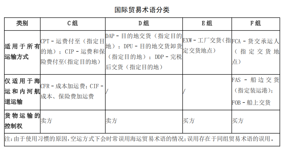 在國際貿(mào)易的貨物銷售合同中,進出口商使用國際商會《國際貿(mào)易術(shù)語解釋通則》(Incoterms),界定買賣雙方在風險、成本、運輸和保險方面的義務,避免誤解、爭議與因此導致的損失以及其他法律難題。根據(jù)最新的《國際貿(mào)易術(shù)語解釋通則》2020版,國際貿(mào)易術(shù)語共分成2類4組11個。